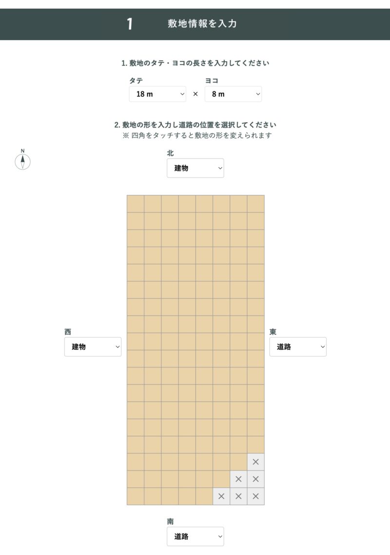 このように敷地は1m単位でざっくりした入力になるようです。隅切り部分はクリックしてグレーに変わって✕が付くと、表現できるようです。
