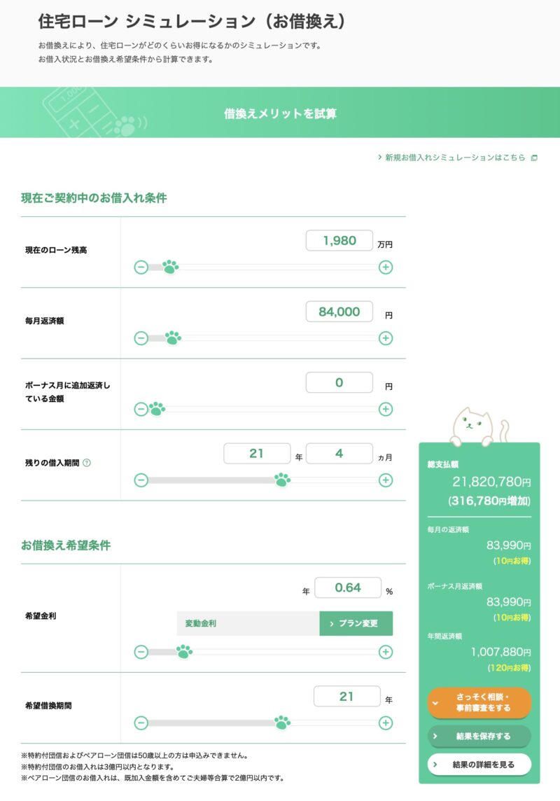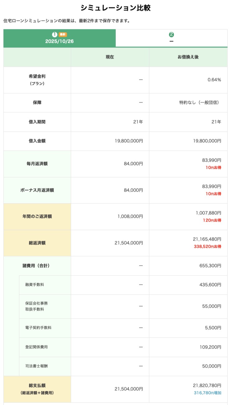 総返済額では、約33.8万円のお得なのですが、諸費用を加えると、約31.6万円の増額になりました。