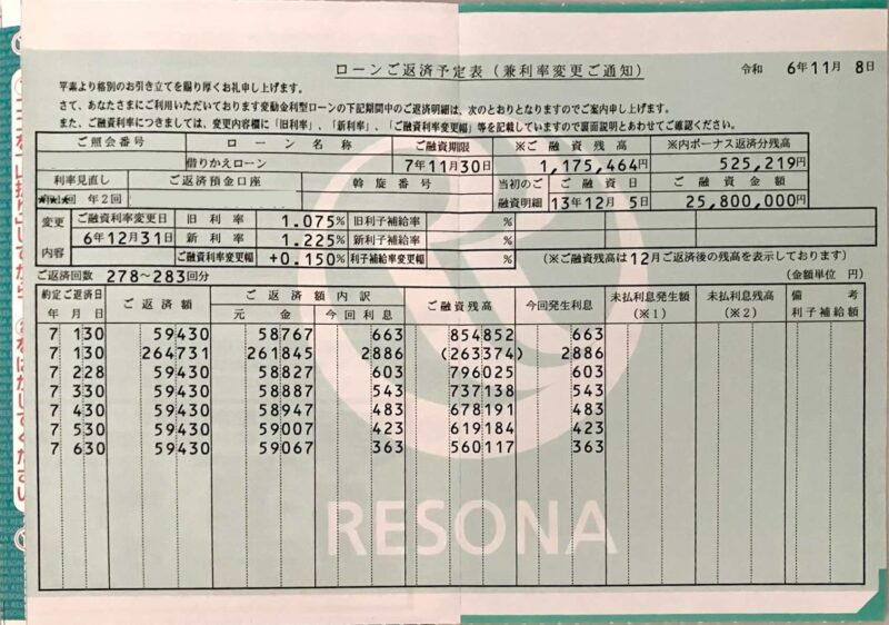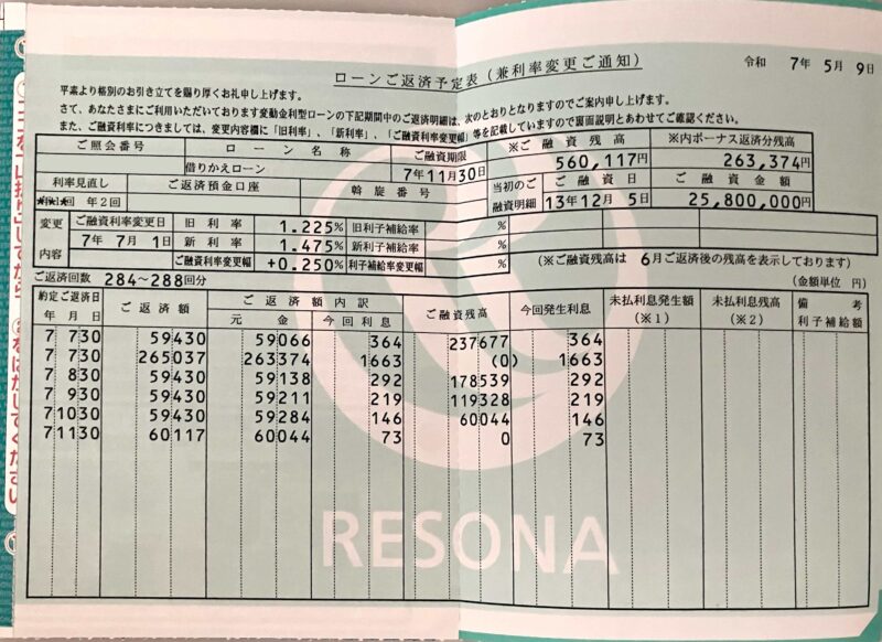 返済金額は変わっていませんが、毎月の元本の返済額が昨年比で約6千円も減って、その分余計に利息を払っていることになります。まさに変動金利の恐ろしさではありますが、我が家の場合、低金利時代に元本を減らすことができたメリットのほうが大きかったと思っています。(特に二本立てだっただけに…)