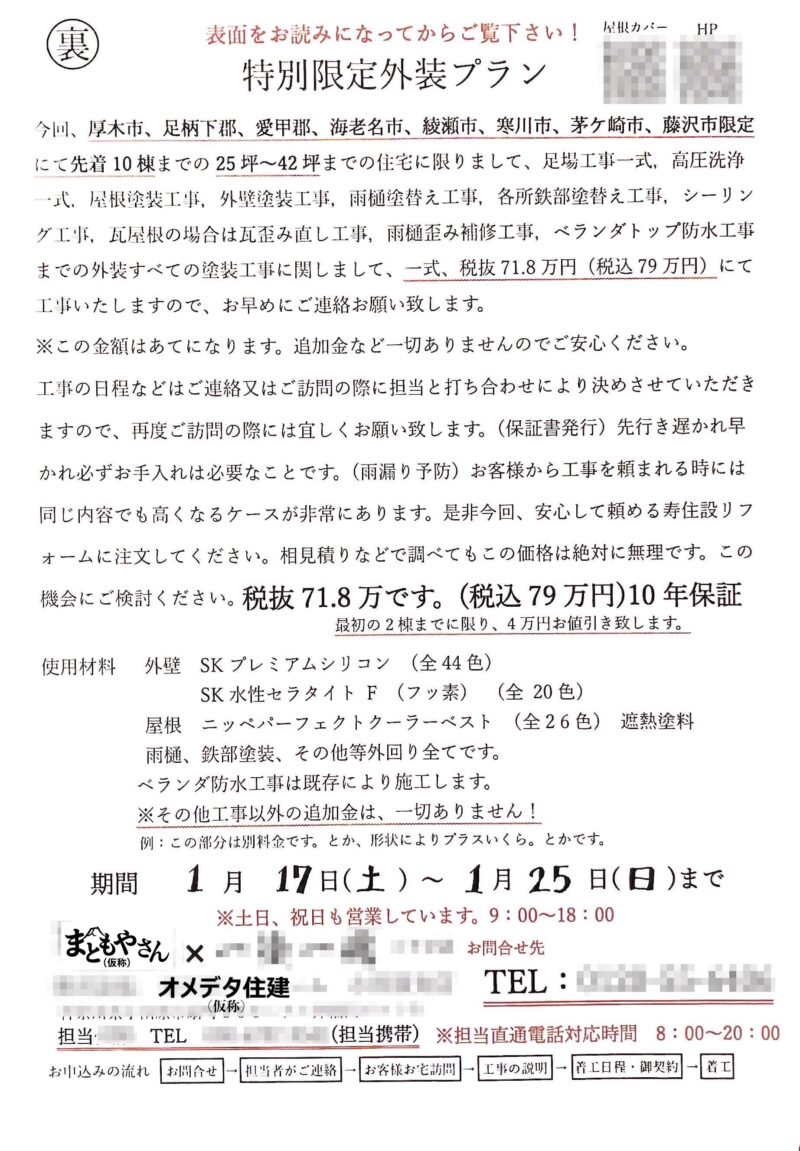 「先着10棟限定。外壁塗装プラン、税込79万円。」