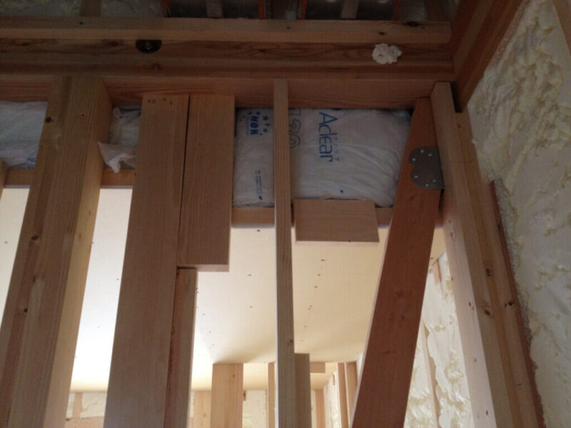 気になったのは、二階の間仕切り壁の上部にあたる部分の気流止めの施工です。