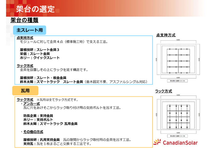 で、気になる金具のことを確認しますと、架台の選定というページにヒントがありました。