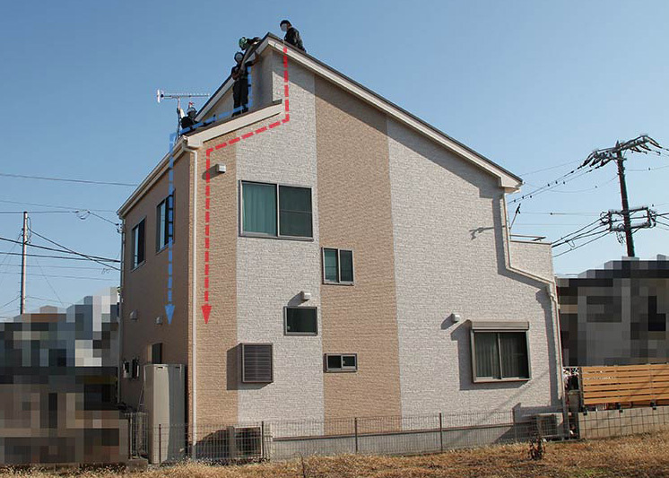 まずは、屋根に登っての点検ですが、このように一旦ハシゴでバルコニーに上がってから、さらにハシゴで屋根上に上がられます。